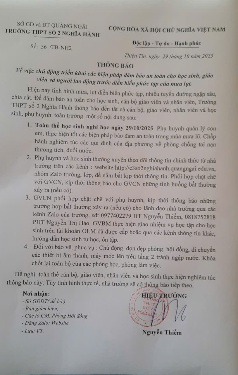 Thông báo về việc triển khai các biện pháp đảm bảo an toàn cho học sinh, giáo viên và người lao động trước diễn biến phức tạp của lũ lụt